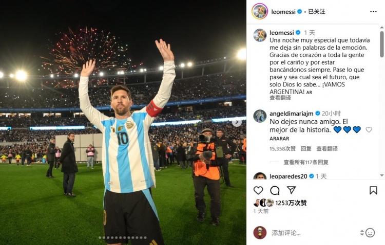 9月7日,梅西通过Instagram发表长文,深情回顾自己在阿根廷国家队的主场告别之战,队友迪马利亚在评论区献上真挚祝福。
