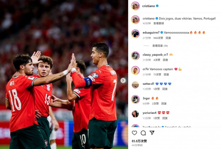 赛后他在社交媒体分享全队庆祝合影,配文道:“两战两胜!继续前进,葡萄牙!”